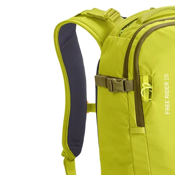 The Ortovox Free Rider 28L backpack fits extra snugly against the back when freeriding in any terrain – just like a second skin This is primarily down to the flat, elasticated CLASP FLEX BELT which provides control in every situation as well as reliable support. The soft back pads hug the back perfectly without restricting the movements of the spine. The focus here is both on your safety and on the environment: This freeriding backpack is completely PFC-free and, thanks to the use of recycled polyester, also climate-neutral.